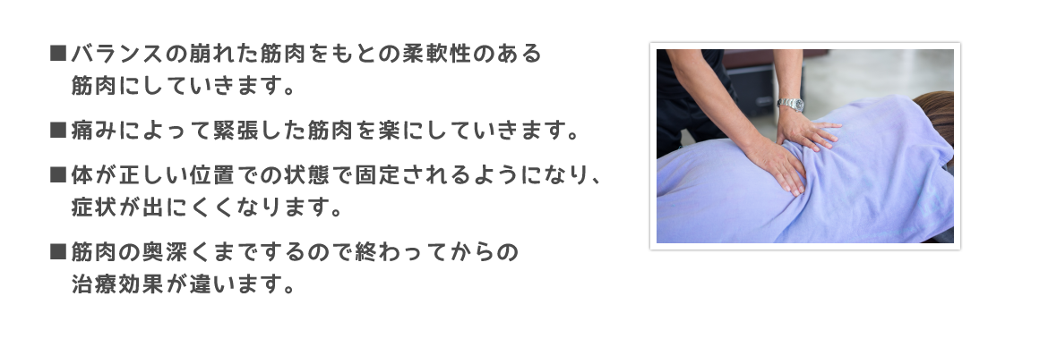 トリガーポイントとは、「痛みの原点」という意味で、疲労した筋肉の奥深くに出来る、硬く凝り固まった部分のことです。、このトリガーポイントを的確に見つけ出し、集中的に患部を圧迫していくことで、コリや根本的な痛みを解消していきます。