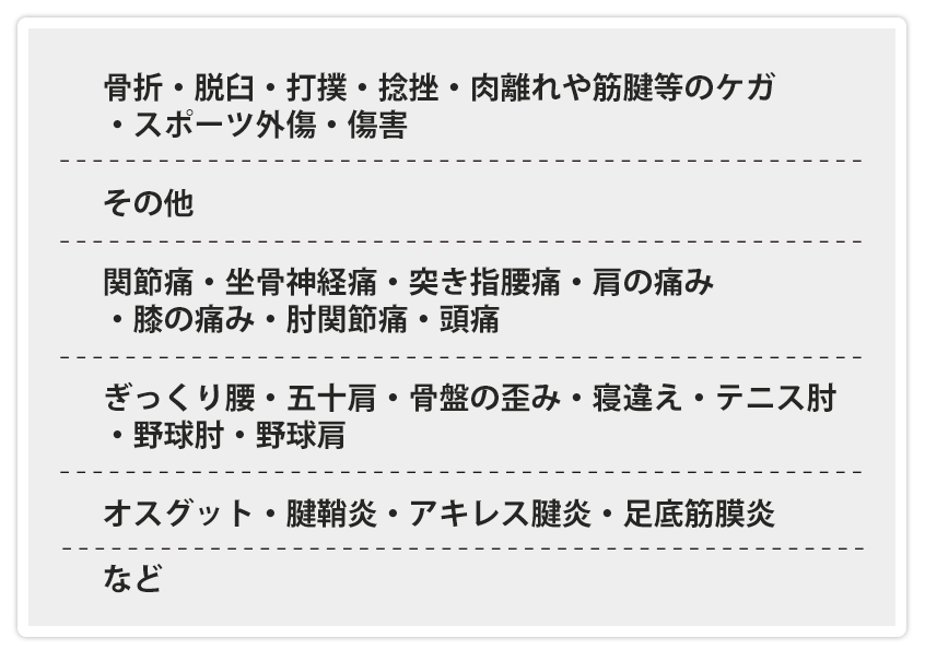 上記以外にも、手足のしびれ・冷え・むちうち症・姿勢等、身体に痛みや違和感がある方は一度ご相談ください。