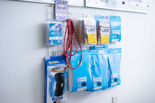 体幹を鍛える為のトレーニングマットや、筋トレ、またはリハビリで使う為のチューブ、膝や腰、足首のサポーターなどいろんな用品が置いてあります。